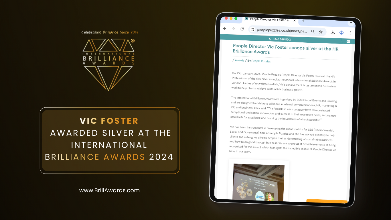 People Puzzles is proud to announce that People Director Vic Foster has been awarded the Silver Prize for “HR Professional of the Year” at the International Brilliance Awards™. Held in London, this recognition honours individuals who demonstrate exceptional dedication to fostering business growth through innovative human resources leadership. Since 2014, the International Brilliance Awards™ have been evaluated by an independent panel of global experts to celebrate professional brilliance across various corporate sectors.